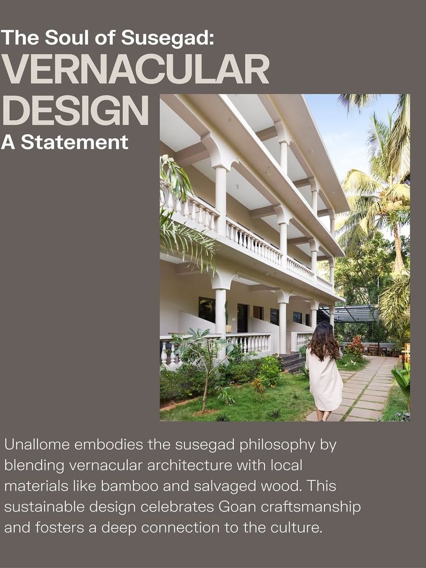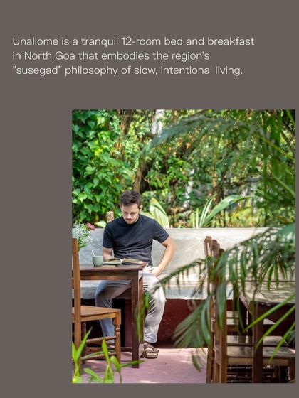 Unallome is a 12-room bed and breakfast in North Goa that embodies the region's "susegad" philosophy of slow, intentional living. The design celebrates vernacular architecture and sustainability, using local materials like salvaged wood, bamboo, and rattan, and fostering a deep connection to Goan culture and craftsmanship.