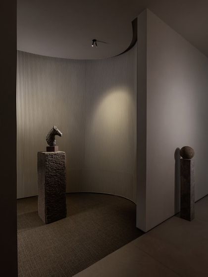 Flooring features bookmatched natural stone or seamless micro-topping for a monolithic look. Walls finished in textured lime plaster or concrete textures that interact with grazing light.