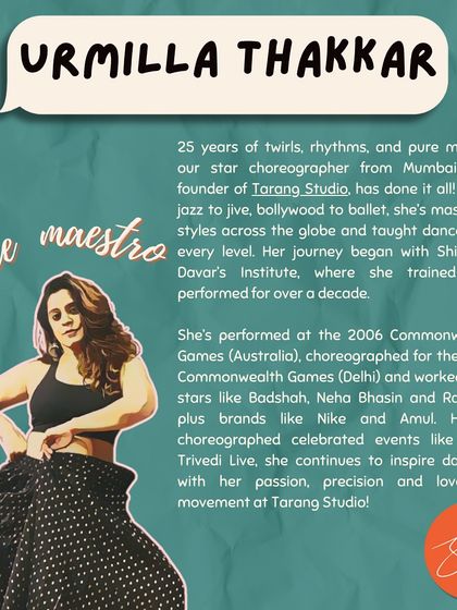 Started with folk, fell for the stage, and never left. Twenty-five years moving, creating, teaching - that’s me. Tarang Studio is my happy place, especially during 'Manch' season. Sangeet madness, studio chaos, and finding my sukoon (peace) in nature - all part of the ride. Forty and still grooving, I’m just here for the next dance, the next story, the next big smile.
