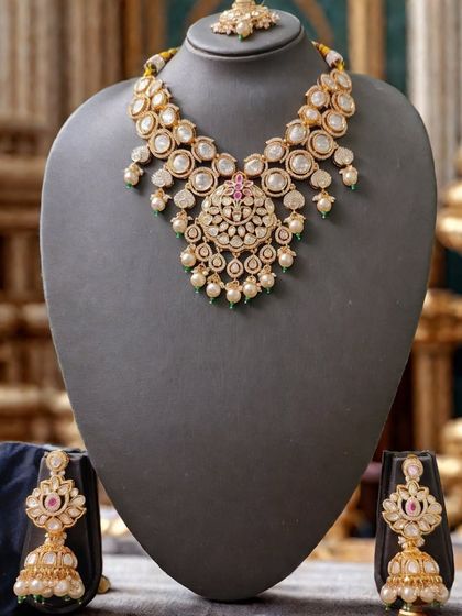 - Classic kundan and polki wedding necklace styles with gold tones, pops of red and green