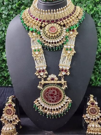 Most sets are full-on bridal - think statement chokers, long rani haars, heavy jhumkas, and maang tikkas. You’ll see: