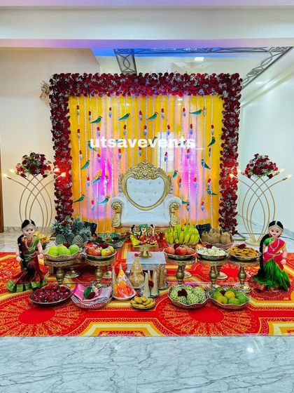 We create and set up traditional ceremonial plates with fresh fruits, homemade sweets, and custom props, delivered and arranged at your venue in Bangalore for any family function.