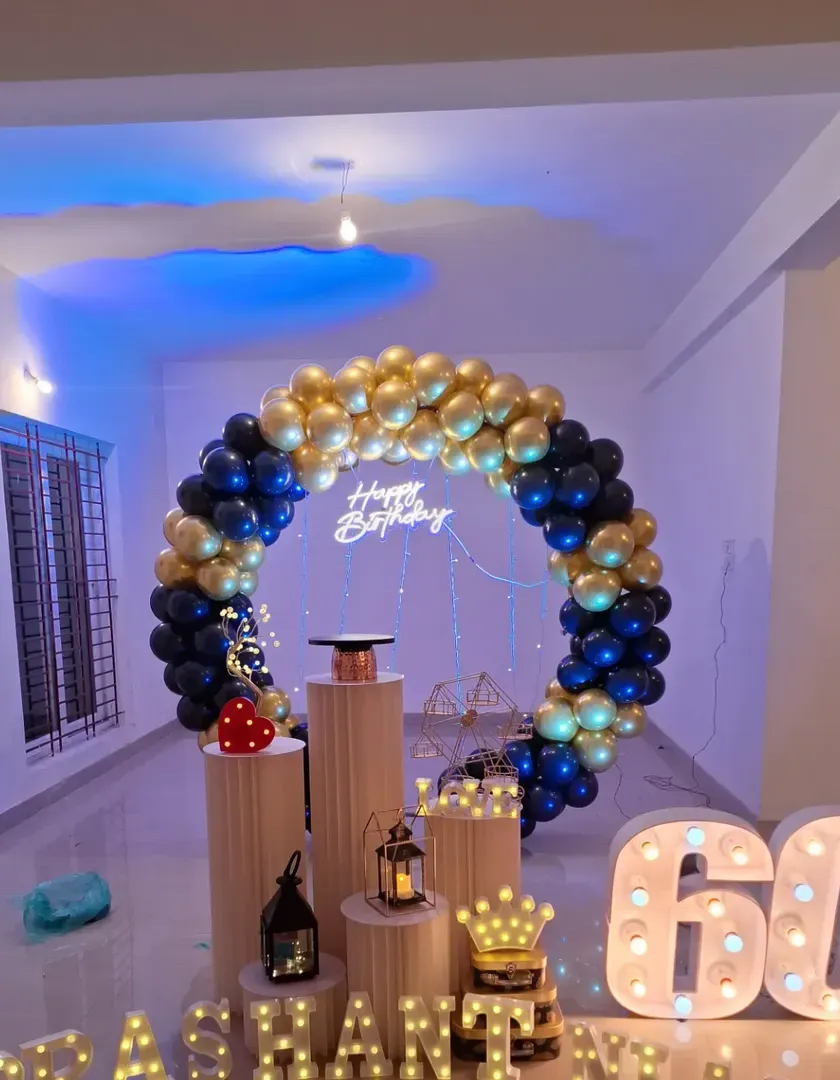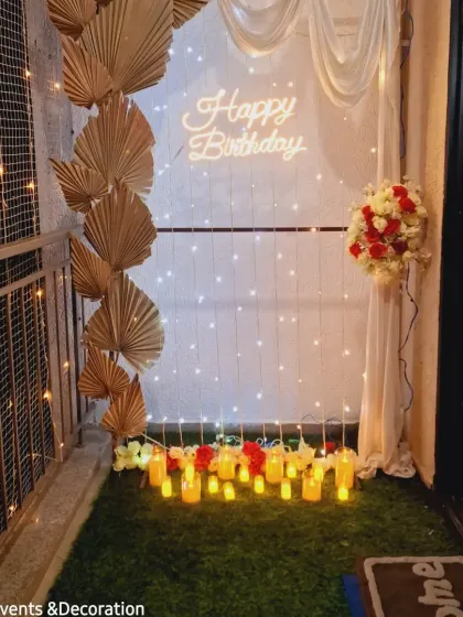 I create beautiful and romantic setups to celebrate your journey together. Whether it's a first anniversary or a silver jubilee, I design the perfect photo backdrop with neon signs, elegant balloon garlands, and floral arrangements. I also provide stage decorations for engagements and other special functions.