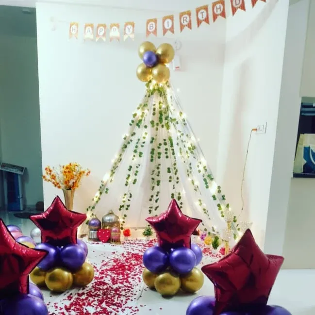 You don't need a big venue to have a beautiful celebration. I specialize in transforming any space in your home, like a living room corner or a balcony, into a special place for your loved ones. I offer cozy teepee tent parties, elegant balcony decor, half-birthday setups, and our popular balloon ring backdrops that fit perfectly in smaller spaces.