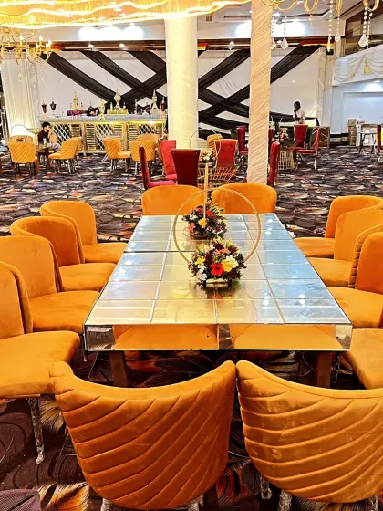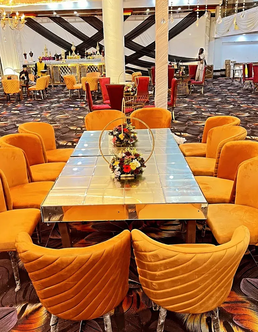 The details complete the look, from guest dining tables to floral centerpieces. I provide a variety of furniture and decor options, including velvet chairs, mirrored tables, and custom floral arrangements for every table.