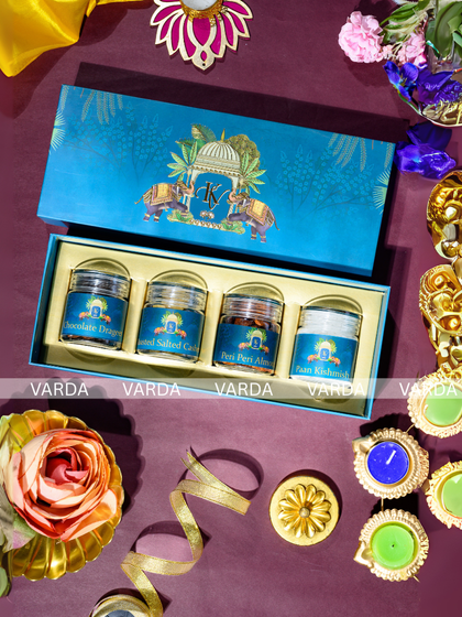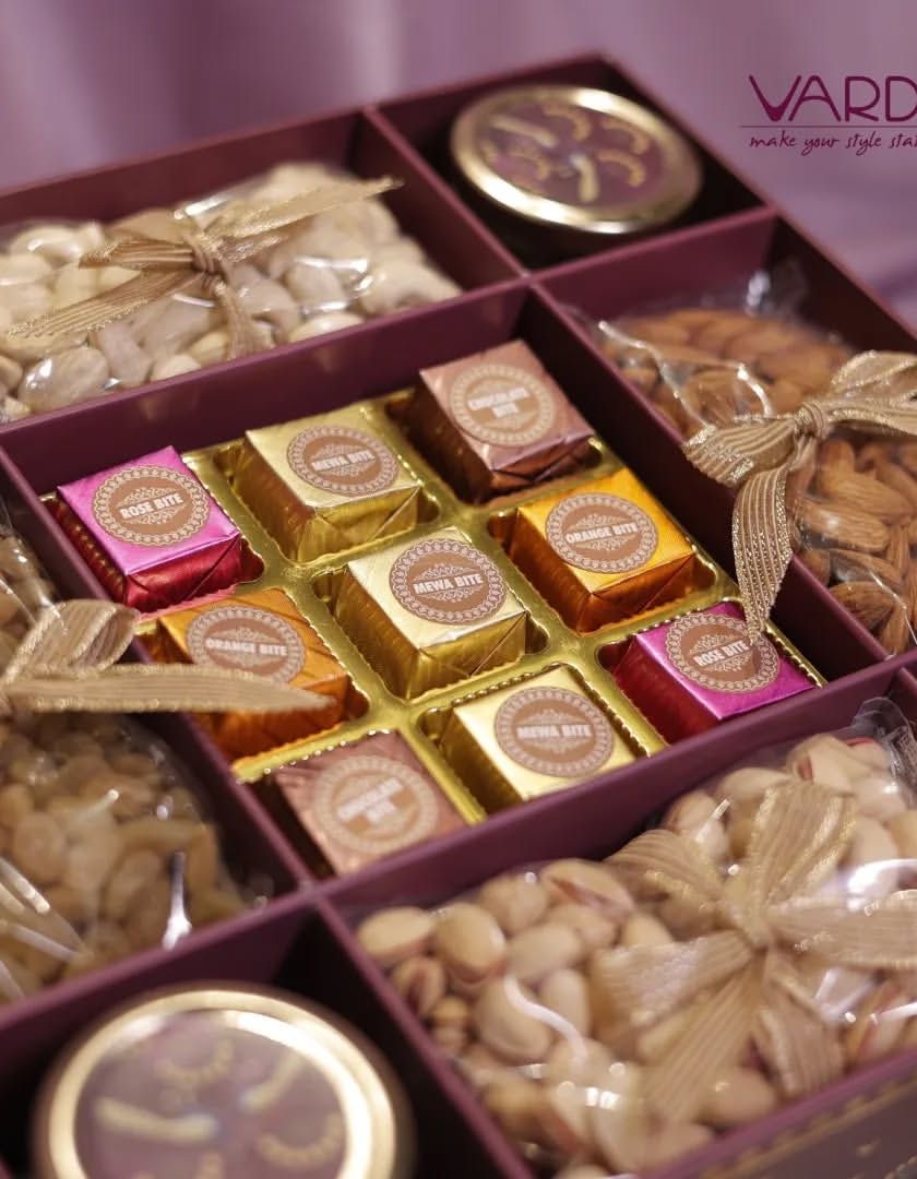 I believe a gift should delight all the senses, which is why I curate these gourmet hampers filled with premium treats. From flavored nuts like Miri Cashew and Blueberry Almond to artisanal chocolates and dry fruits, each hamper is packed with care to offer a taste of luxury.