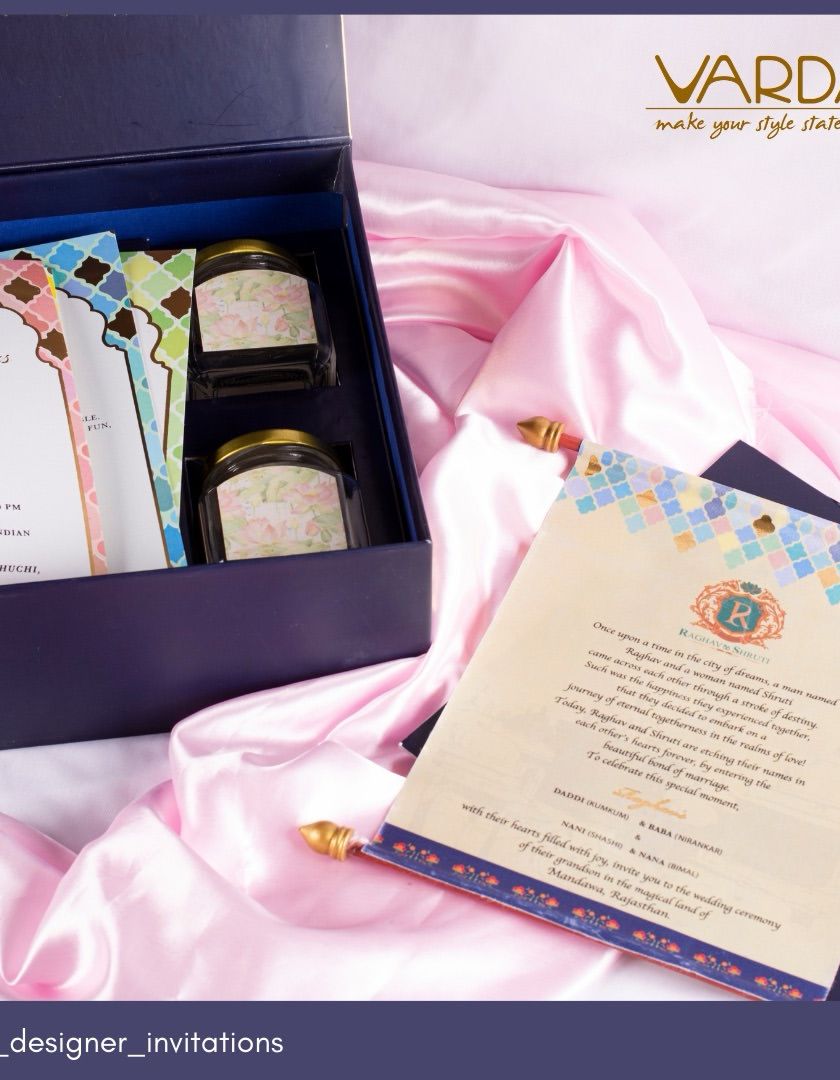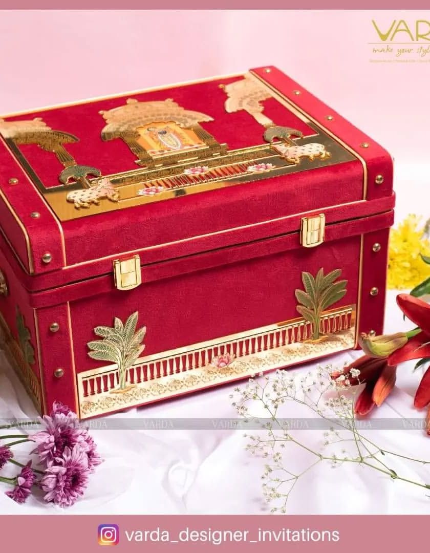 I design these invitation boxes to capture the essence of a royal Indian wedding. Drawing inspiration from Rajasthani and Marwari heritage, I use rich fabrics like velvet, intricate palace and procession motifs, and a palette of deep reds, blues, and golds to create an unforgettable first impression for your guests.