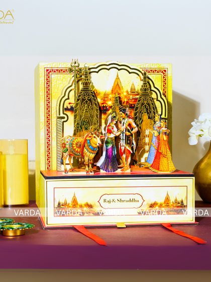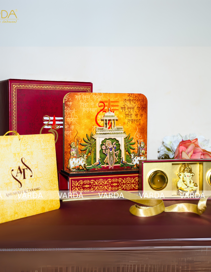 For celebrations centered around faith and tradition, I create these devotional gift boxes. Featuring sacred art like Pichwai paintings or 3D depictions of deities like Ram-Sita, Shreenathji, and Ganesha, each box is a spiritual keepsake that honors your sacred union.