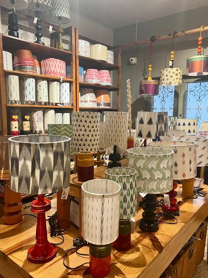 We create unique lighting pieces that blend traditional Channapatna woodcraft with handloom textiles. Our collection includes table and wall lamps featuring wooden bases paired with fabrics like khann, khana, kala cotton and ikkat.