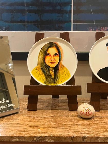I turn your photos into custom portraits or caricatures in pencil, acrylic, digital, or on ceramic plates, and you can choose the style and details you want.