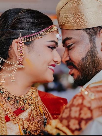 Couples seeking high-quality wedding photography that captures both staged portraits and candid moments, particularly those planning South Indian weddings or themed celebrations.