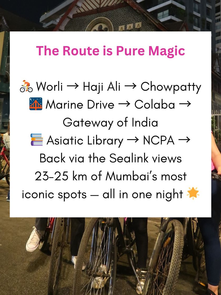This is our signature tour. We ride every Friday and Saturday night, covering 23-25 km of South Mumbai's most famous landmarks when the streets are quiet and the air is cool. It’s not a race, but a relaxed, guided tour for anyone who can ride a cycle.