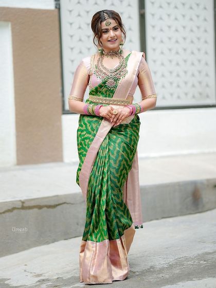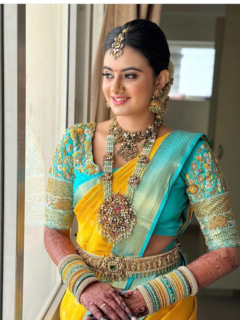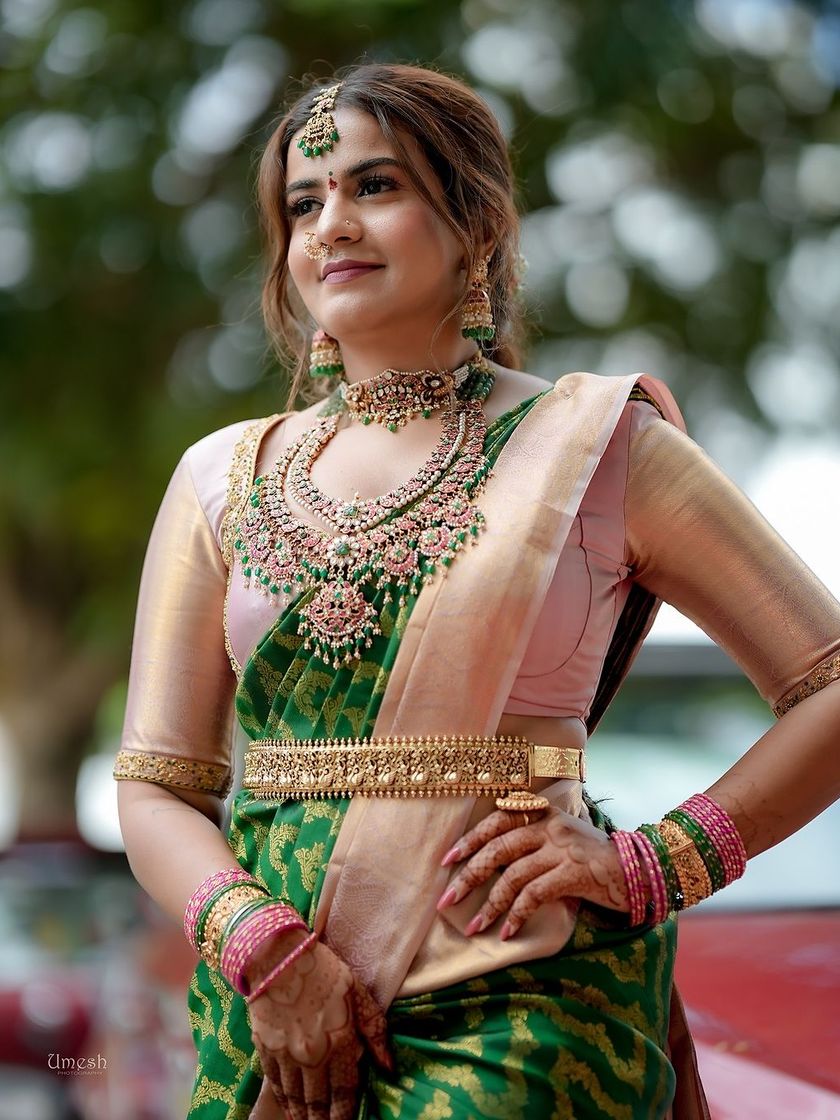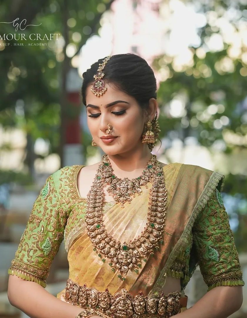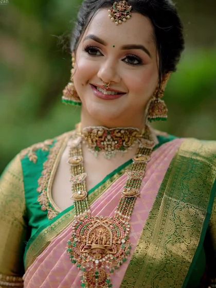 This collection is my tribute to the rich heritage of South India. You will find classic temple jewellery with divine motifs, antique gold-finish harams and chokers, and pieces studded with vibrant kemp stones, perfect for your Muhurtham.