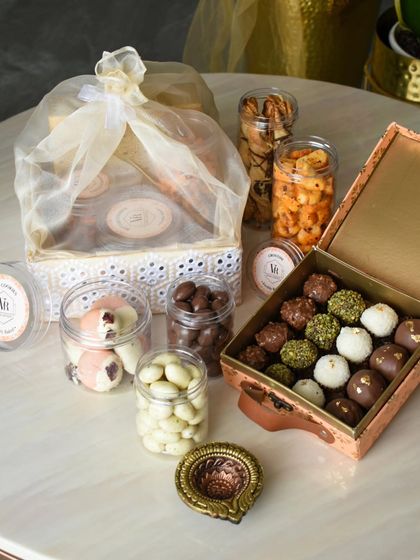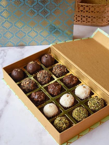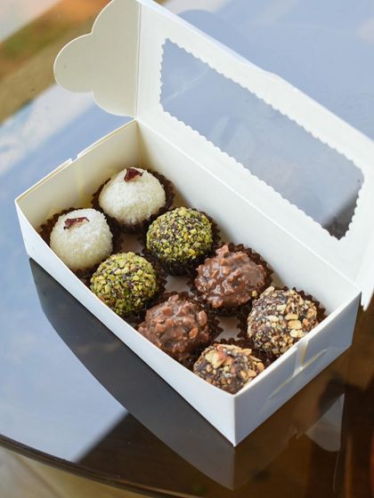 - Custom corporate hampers packed with our signature chocolate truffles (think pistachio, coconut, nuts)