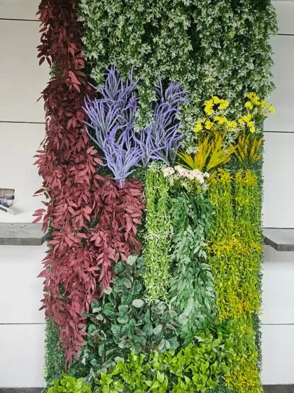 If you’re a plant lover, I use real plants in modular setups, with drip irrigation for easy upkeep. For those who want zero maintenance, I make artificial green wall panels that always look perfect and can be customised with logos or colours. Both styles hide ugly pipes, grills, or AC units, and make any wall stand out.