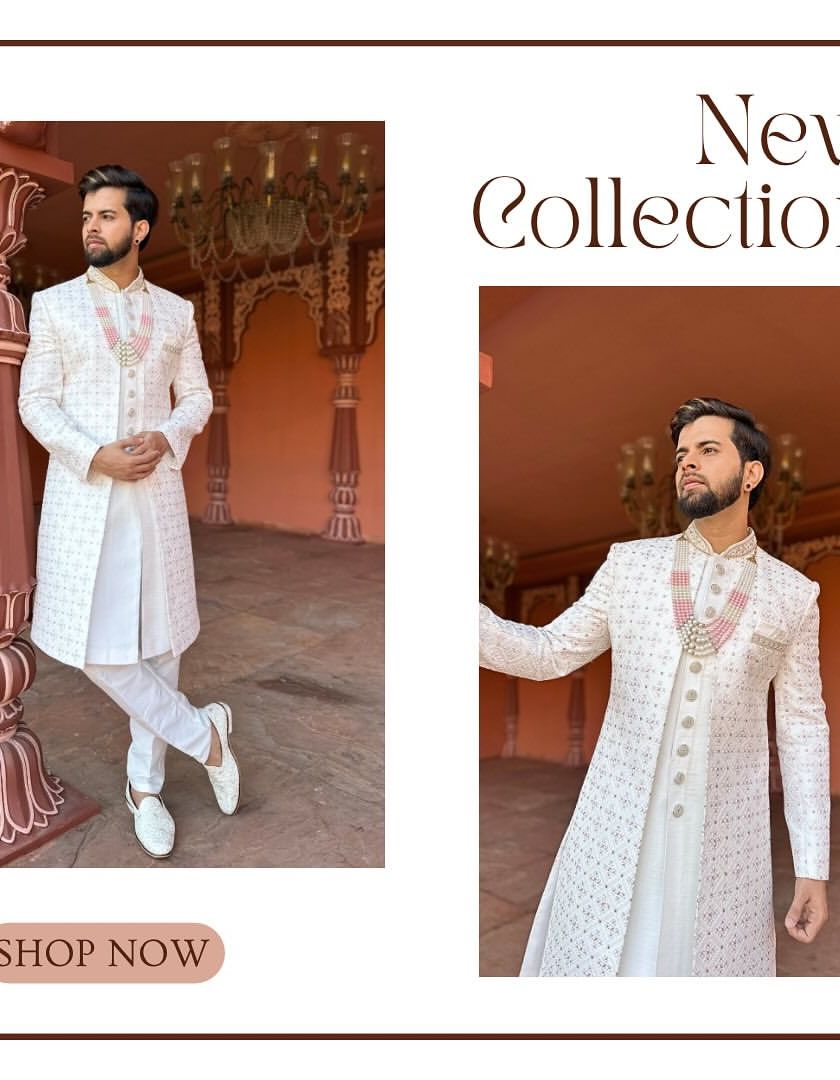 For the wedding ceremony or pre-wedding functions, we create custom-made sherwanis and Indo-Western outfits that are truly yours. We offer a variety of fabrics, colors, and hand-embroidery options, including regal all-white looks, rich jewel tones, and modern pastel shades.