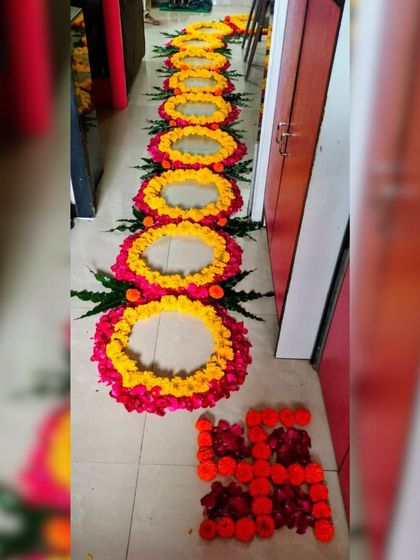 We create beautiful, handcrafted floral rangolis and floor decorations. Using fresh petals, we design everything from intricate traditional patterns to welcome messages, adding a unique and artistic element to your event space.