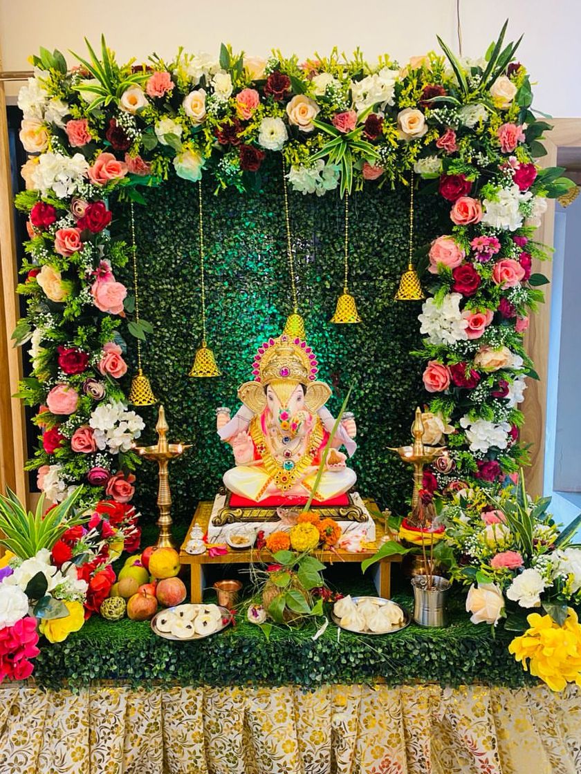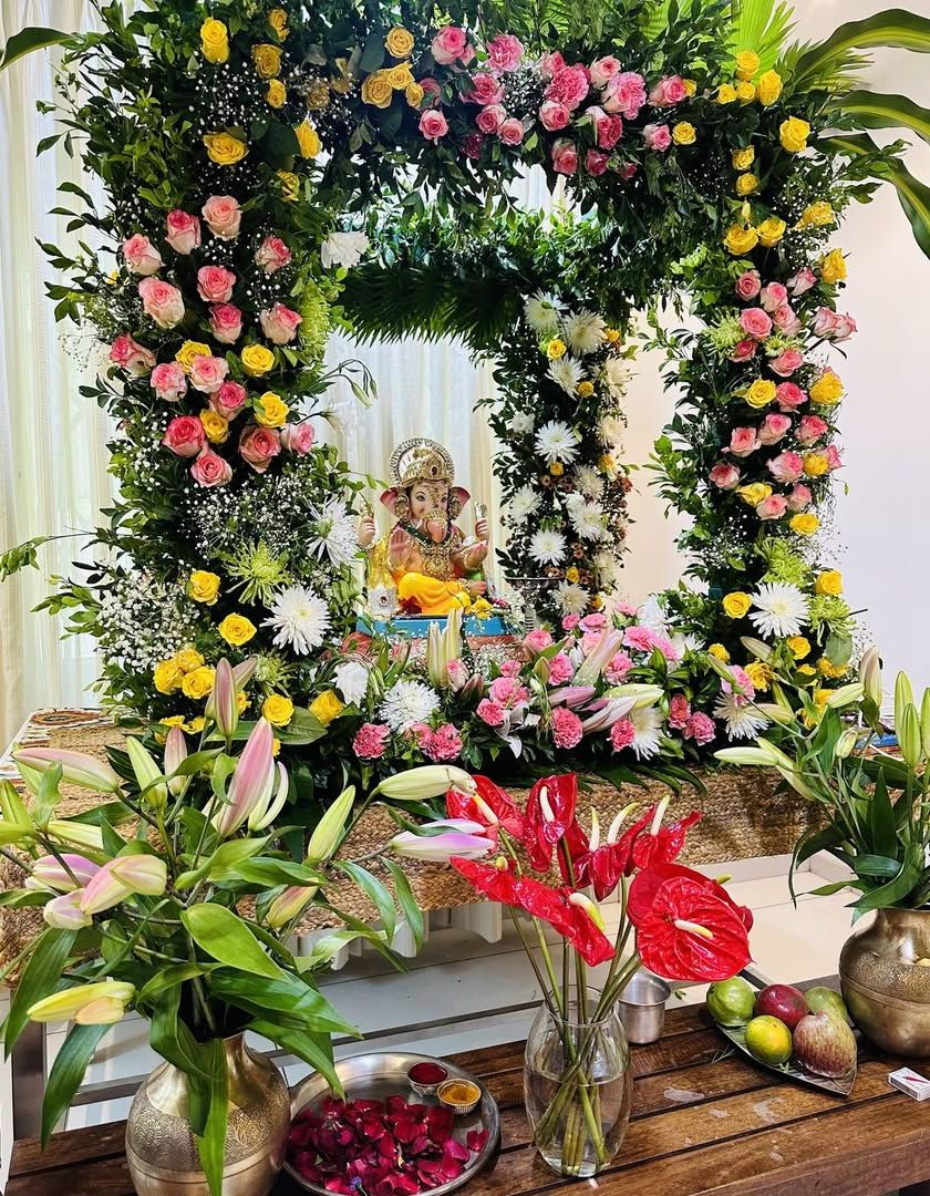 Our specialty is creating the perfect home for Ganpati Bappa. We design complete mandap setups, from traditional marigold themes that evoke timeless devotion to modern, elegant arrangements using roses, orchids, and lush greens.