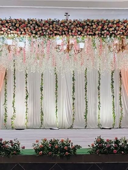 - Mandap & Stage: I do everything from classic floral mandaps to modern circular backdrops. Reception stage backdrop ideas with pastel drapes or custom monograms are trending, and I love pulling them off.