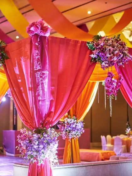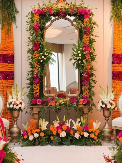 It's the small details that create a magical atmosphere. We specialize in creating beautiful floor arrangements, traditional flower rangoli, and decorating ceremonial items like lamps to add a touch of artistry to your event space.