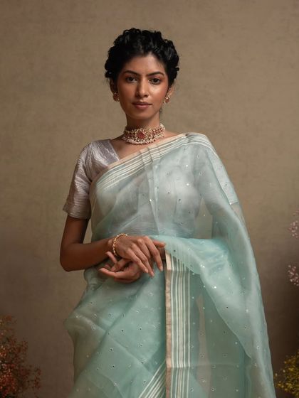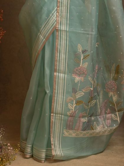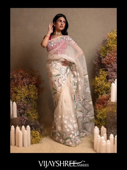 We specialize in dreamy organza sarees featuring delicate hand embroidery and enchanting floral designs. Each piece showcases intricate craftsmanship with detailed threadwork and elegant patterns.