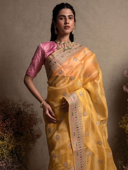 - Antique gold organza with Paithani borders, Pichwai prints on tussar - options for every function.