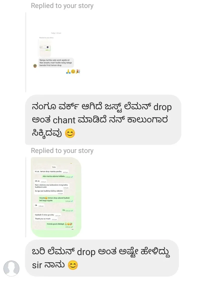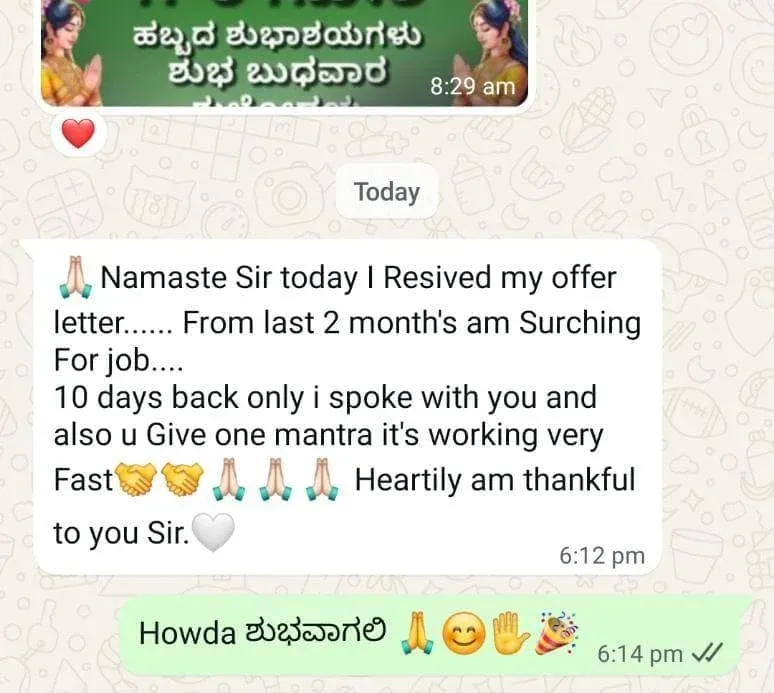 I don't make fake promises. Here are real WhatsApp messages from people who have seen positive changes after following my simple, practical remedies for issues like finding jobs, recovering lost items, business growth, and health problems. Their success is a testament to their faith and the power of these mantras.