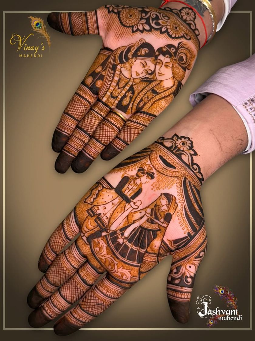 Grooms, it's your time to shine too. We create custom mehndi that tells your story, from detailed portraits of your wedding moments and initials to simpler, symbolic designs for a modern look.