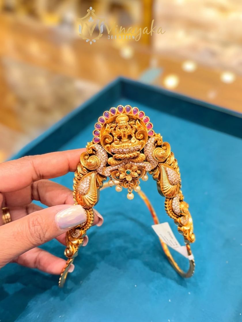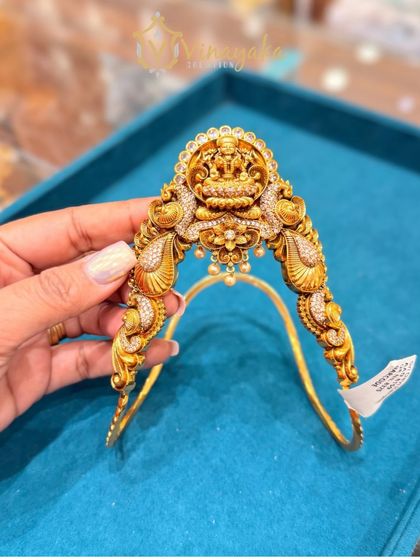 My collection includes a wide range of divine temple and South Indian jewellery. Discover intricately crafted Lakshmi haars, mango malas, and stunning bajubands (armlets) with a rich, antique gold finish, perfect for brides and festive occasions.