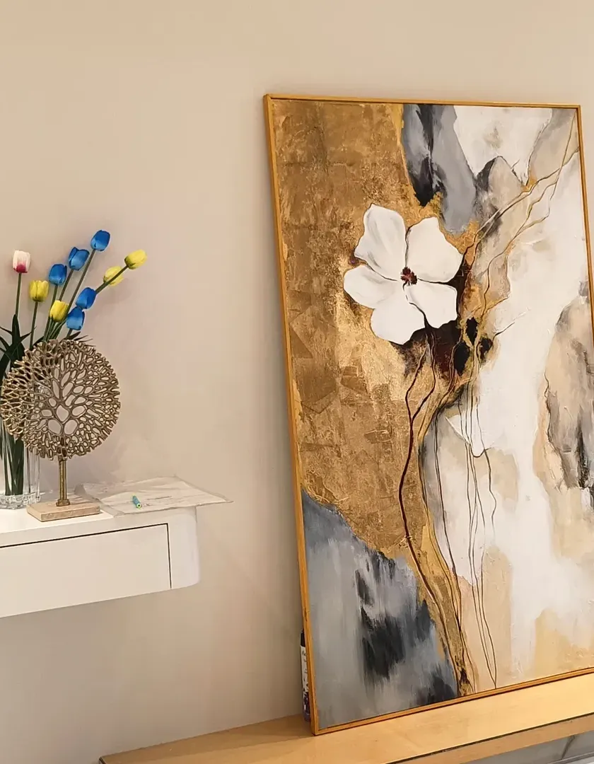 In addition to large-scale murals, I also create original textured art on canvas. These pieces feature my signature 3D sculpting techniques, often combined with abstract painting and gold leaf. Each framed painting is a unique, ready-to-hang artwork for your home or office.
