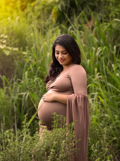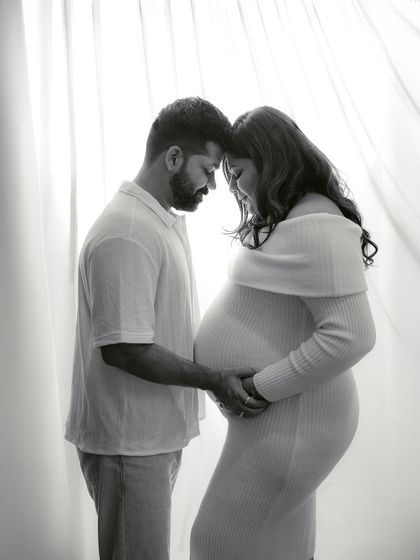We specialize in capturing the beauty of pregnancy through elegant and artistic maternity photography sessions. Our sessions are ideally timed between 27-34 weeks of pregnancy, offering various styles including elegant studio portraits, cultural themes with traditional Indian elements, and outdoor natural settings.