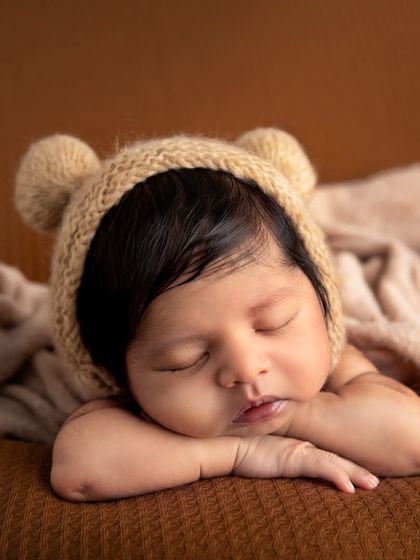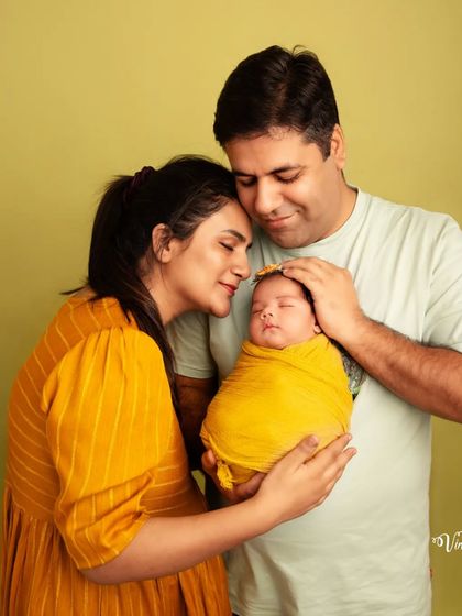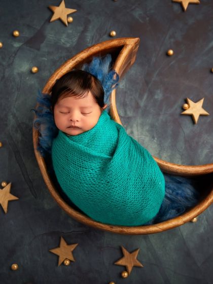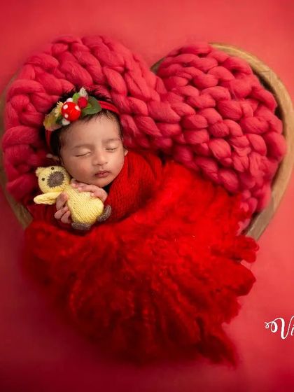 We do safe newborn photoshoots for babies aged 5 to 15 days, at our Bangalore studio or your home, with props, themes, and family included.