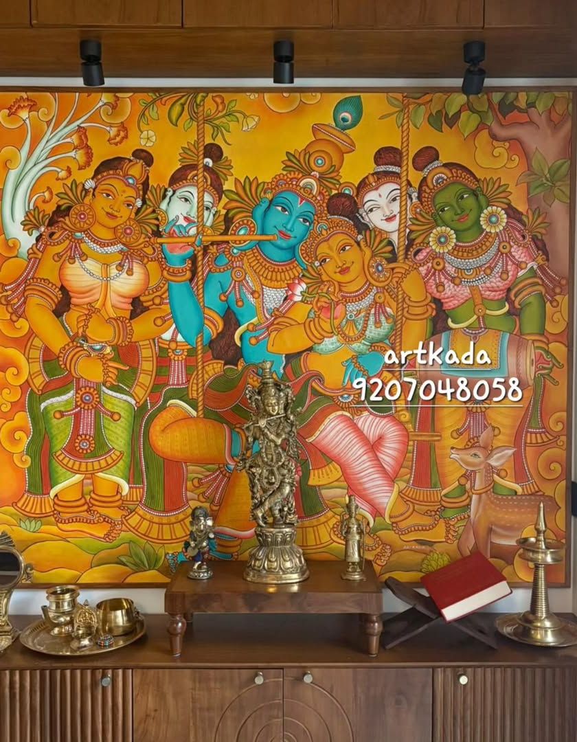 The story of Radha and Krishna is one of my favourite themes to bring to life on canvas. I focus on capturing their divine love and playfulness using the classic Kerala mural painting style, with its characteristic colours and detailed ornamentation. These paintings are perfect for creating a focal point of devotion and beauty in your home.