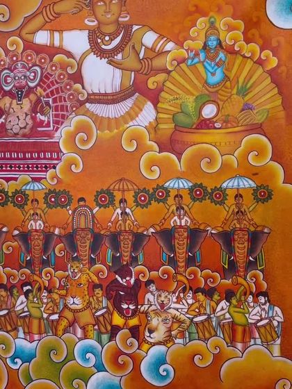 'Keraleeyam' is a special theme where I create a grand collage of Kerala's rich cultural heritage on a single canvas. These paintings bring together elements like the majestic art forms of Kathakali and Theyyam, the energy of the Thrissur Pooram, and the grace of Mohiniyattam. It is a celebration of everything that makes Kerala unique.