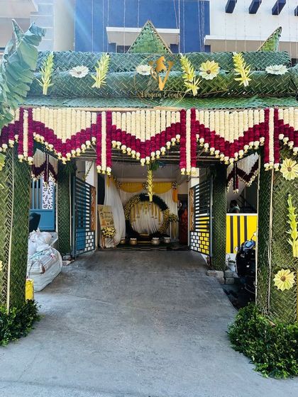 - Arch: Traditional coconut leaf 'Chapra' arch with fresh flower garlands (Premium).