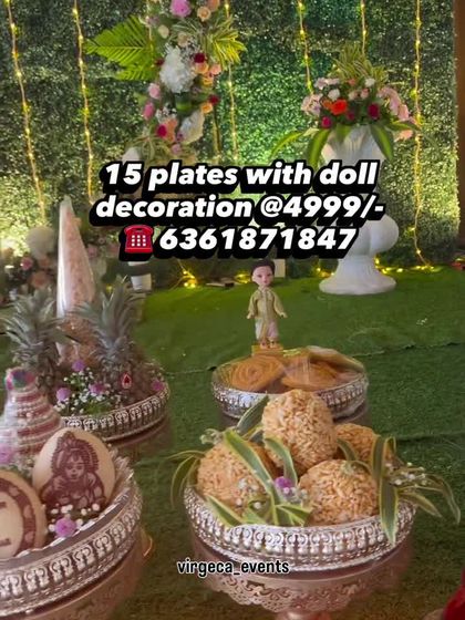 We design and set up traditional South Indian ceremonial plates with custom details for any event, using authentic dolls, motifs, and fresh items, and can source everything or work with what you provide.