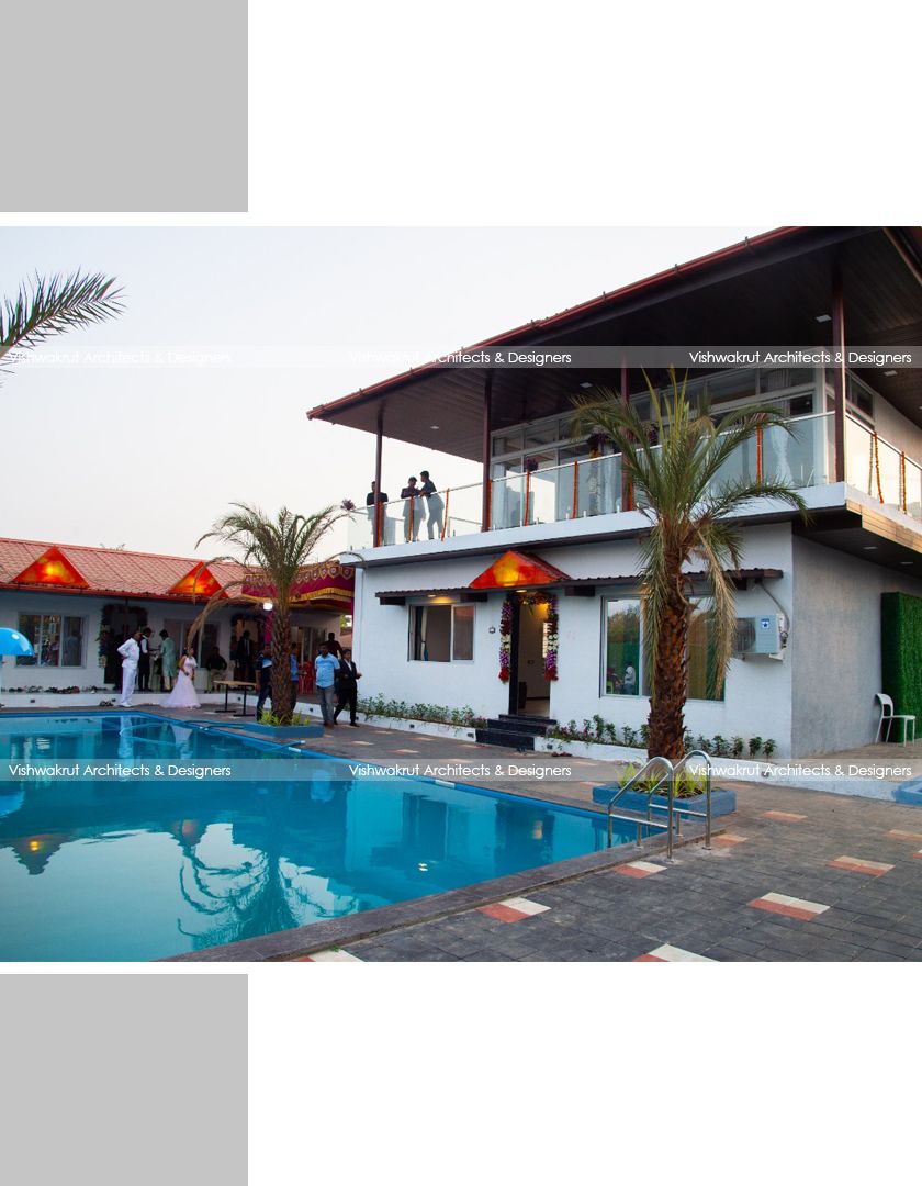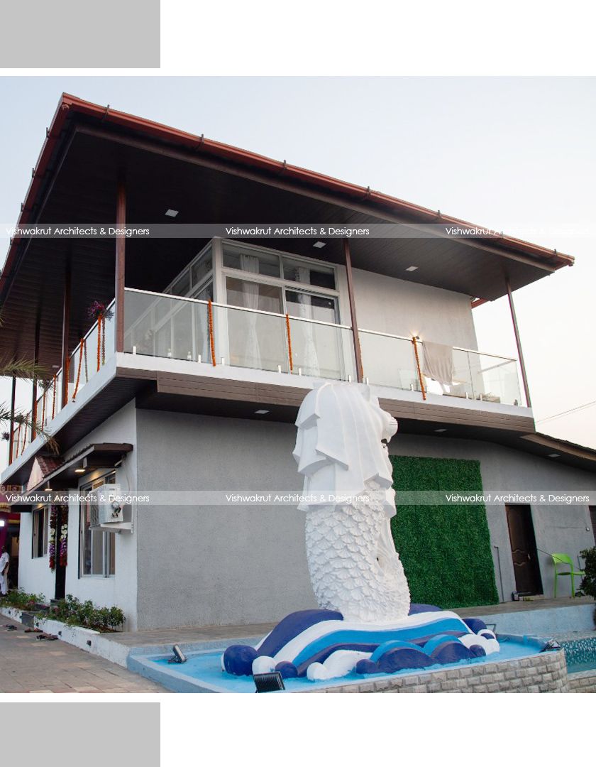 This project in Wakadi, Panvel, is a modern glasshouse-style villa designed to feel like a luxury resort. I focused on bringing the outdoors in with a glass facade, a large pool with a unique Merlion feature, and high-end interiors for a complete weekend getaway experience.