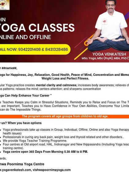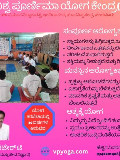 Namaste, we are Vishwa Poornima Yoga Centre. Started with zero cash, just a dream and heart full of seva. Dr. Venkatesh, son of a simple farmer, left his IT job to follow yoga. COVID almost shut us down, but our students and Gurus kept us going. From tiny beginnings to teaching 50,000+ people, we believe—badavaragi huttodu tappalla, badavarage saaytini annodu not correct (born poor is not wrong, dying poor is not right). We want to build happy leaders and a samruddha desha. That’s our journey.