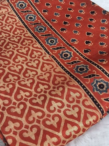 - Ajrakh: Multi-stage resist dyeing with geometric patterns in indigo and madder red.
