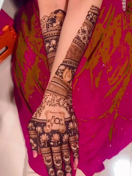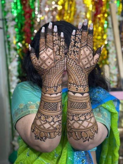 A complete bridal look involves beautiful mehndi on both hands and feet. I create coordinated designs that flow from your arms down to your toes, ensuring a stunning and cohesive look for your wedding day.