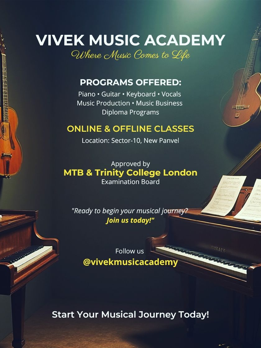 We offer a wide range of programs from instrument training in piano and guitar to diploma courses, all approved by Trinity College London and MTB. Choose to learn with us online or at our New Panvel campus, with flexible options designed to fit your schedule.