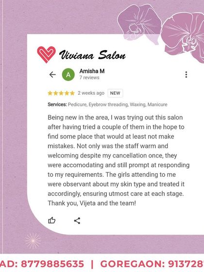 Hi, I’m Vijeta, and Viviana Salon is my baby. Started in 2017, now we’re in Malad and Goregaon. My team, especially Shefali and Harshada, they’re just magic with our regulars. Some clients, they’ve stuck with us for years - feels like family, honestly. We do silly things like lucky draws, festive deals, just to spread some cheer. When someone says they’ve been with us since day one, that’s the real reward.