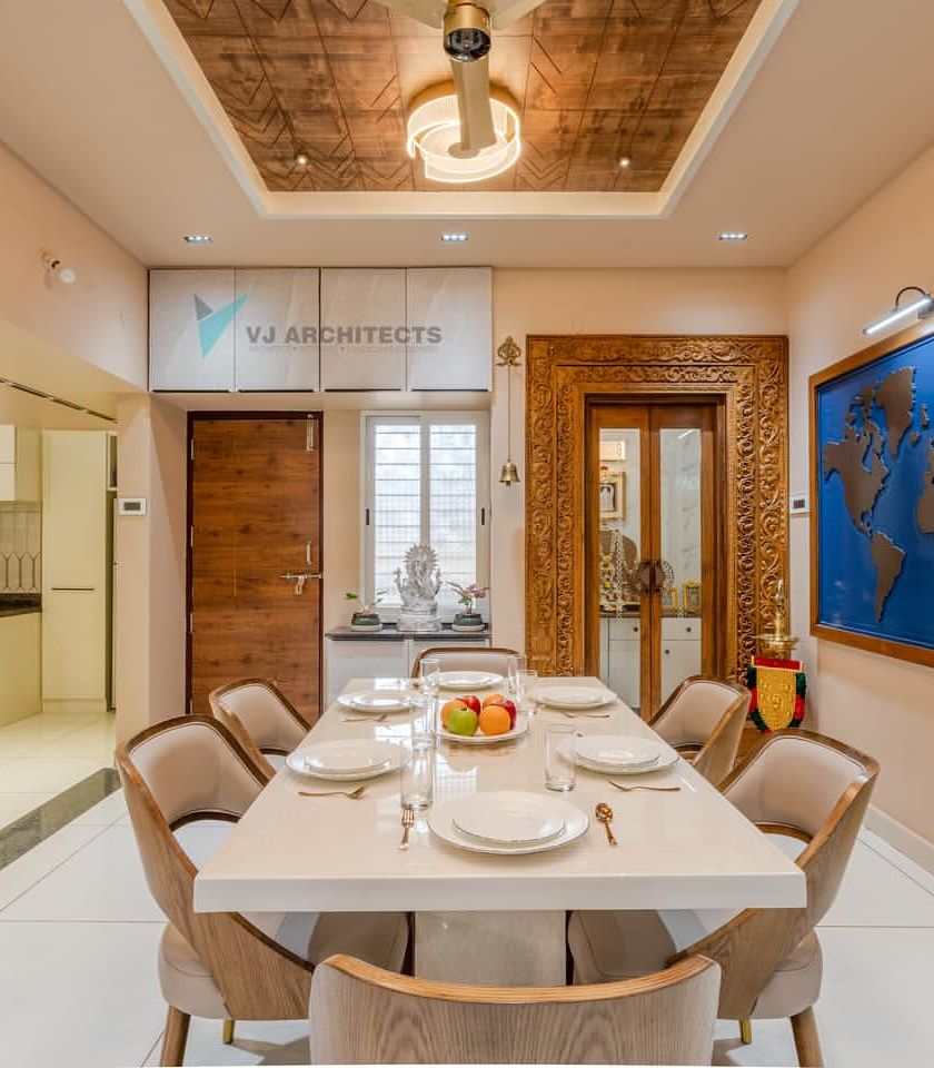 This project was for a hodophile couple who wanted their home to be a haven that reflected their love for travel. We created a unique fusion of traditional South Indian elements, like the intricately carved door, with a contemporary minimalist aesthetic, using a warm, earthy palette of beige, grey, and driftwood to create a tranquil atmosphere.