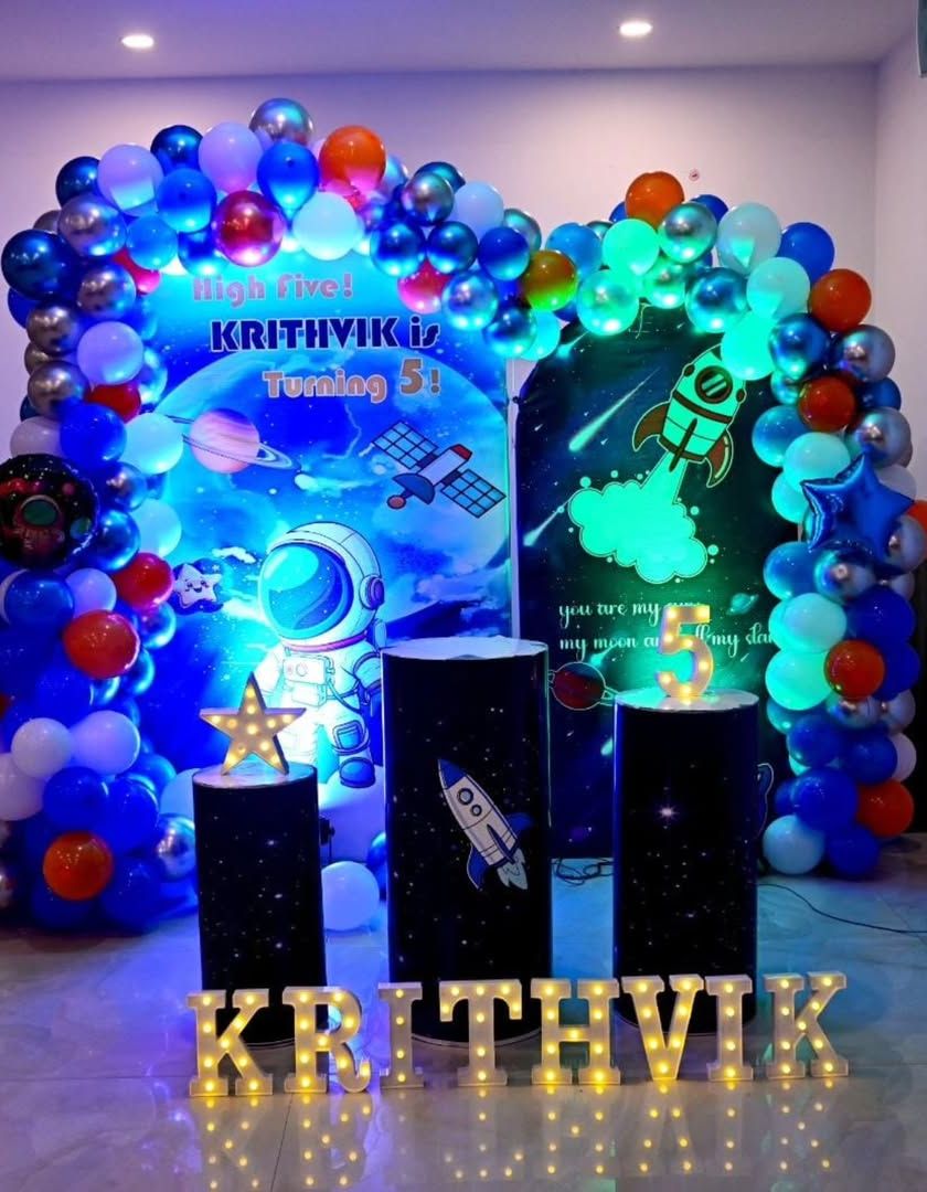 I specialize in creating memorable birthday parties for children with a variety of themes. This includes popular choices like space adventures, jungle safaris, sports like cricket and football, and character themes such as Cocomelon or unicorns. Each setup is complete with custom backdrops, balloon arches, and props to bring your child's favorite world to life.