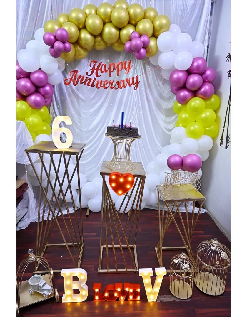 I create elegant and romantic setups for anniversaries or surprise parties. These often feature sophisticated color palettes, balloon arches, and custom lighting to set the mood for your special celebration.