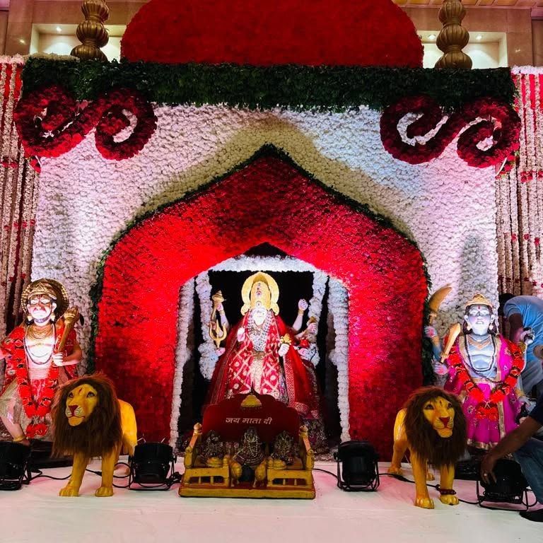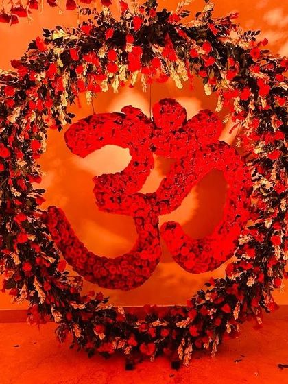 For Mata ki Chowki and other Devi pujas, I focus on creating a vibrant and devotional atmosphere filled with energy. I use a lot of red, marigolds, and gold accents, along with custom backdrops and floral art featuring sacred symbols to honor the Goddess.