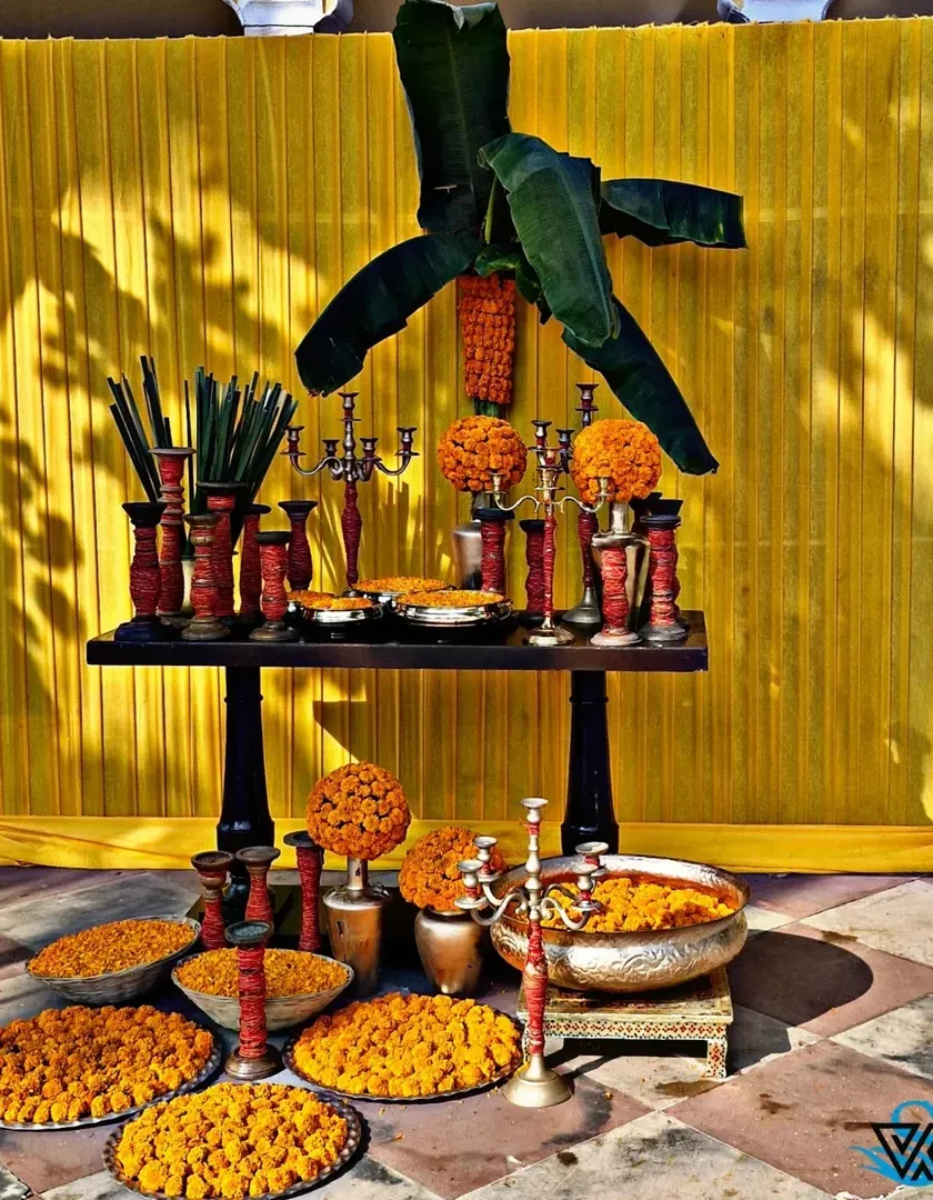 I design Haldi ceremony decor that is full of joy, tradition, and vibrant color. Using elements like fresh marigolds, banana leaves, and traditional brass vessels, I create a cheerful and authentic atmosphere perfect for these happy pre wedding celebrations.
