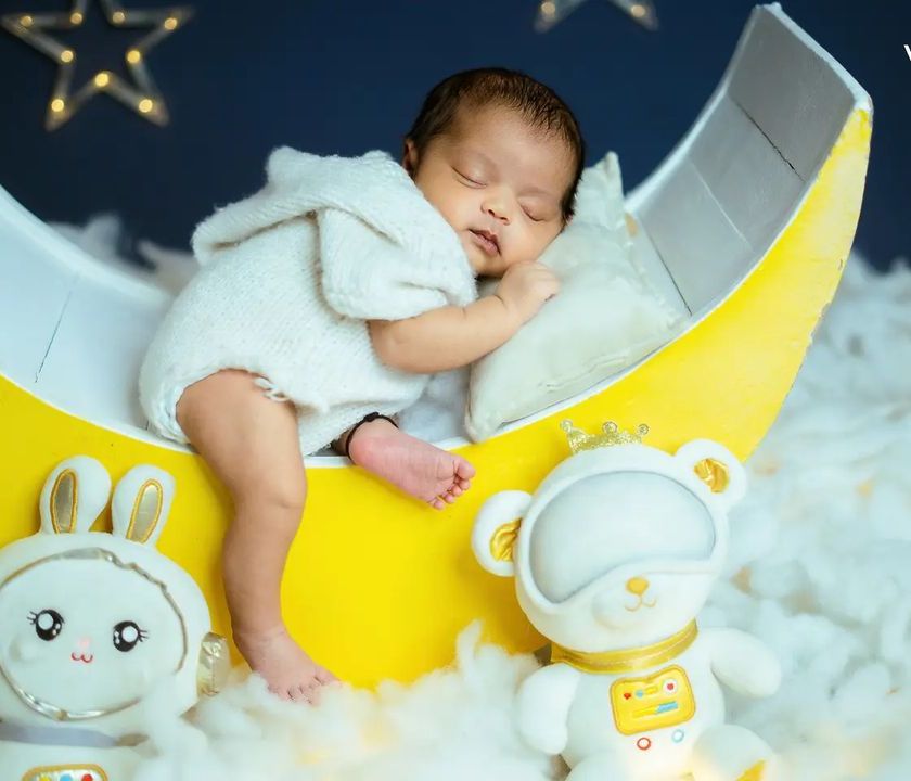 I create magical, safe, and cozy setups for your newborn in my Bangalore studio. This collection showcases popular themes like the dreamy 'Blue Moon' and festive 'Santa', complete with all props and outfits to create timeless first portraits.