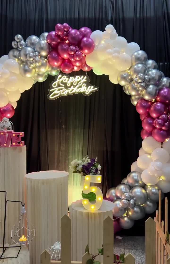 We create stunning photo backdrops for birthdays of all ages, from a child's first birthday to a 25th celebration. Our service includes popular circular balloon rings, custom color themes, neon signs, and marquee letters for names and ages.