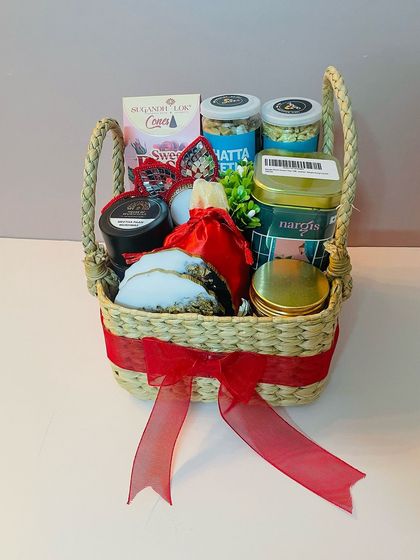 We offer a beautiful range of eco-friendly and stylish open hampers, including hand-woven Kauna grass baskets, chic macrame trays, and rustic pinewood crates. These options are perfect for creating a visually appealing gift display and can be reused as home decor.